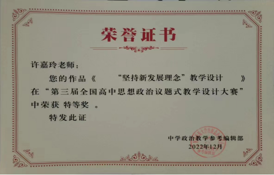 经过激烈的角逐,2022年12月,由陕西师范大学出版总社中学政治教学参考编辑部主办的第三届全国高中思想政治议题式教学设计大赛落下帷幕。2022级学科教学(思政)专业硕士研究生许嘉玲在指导教师方晓波副教授的指导下斩获特等奖。
