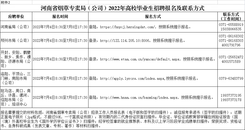 附件2.河南省烟草专卖局(公司)2022年高校毕业生招聘报名及联系方式