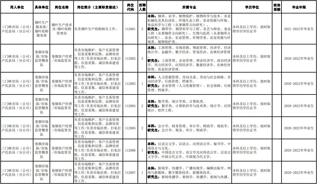 附件1.河南省烟草专卖局(公司)2022年高校毕业生招聘岗位明细表