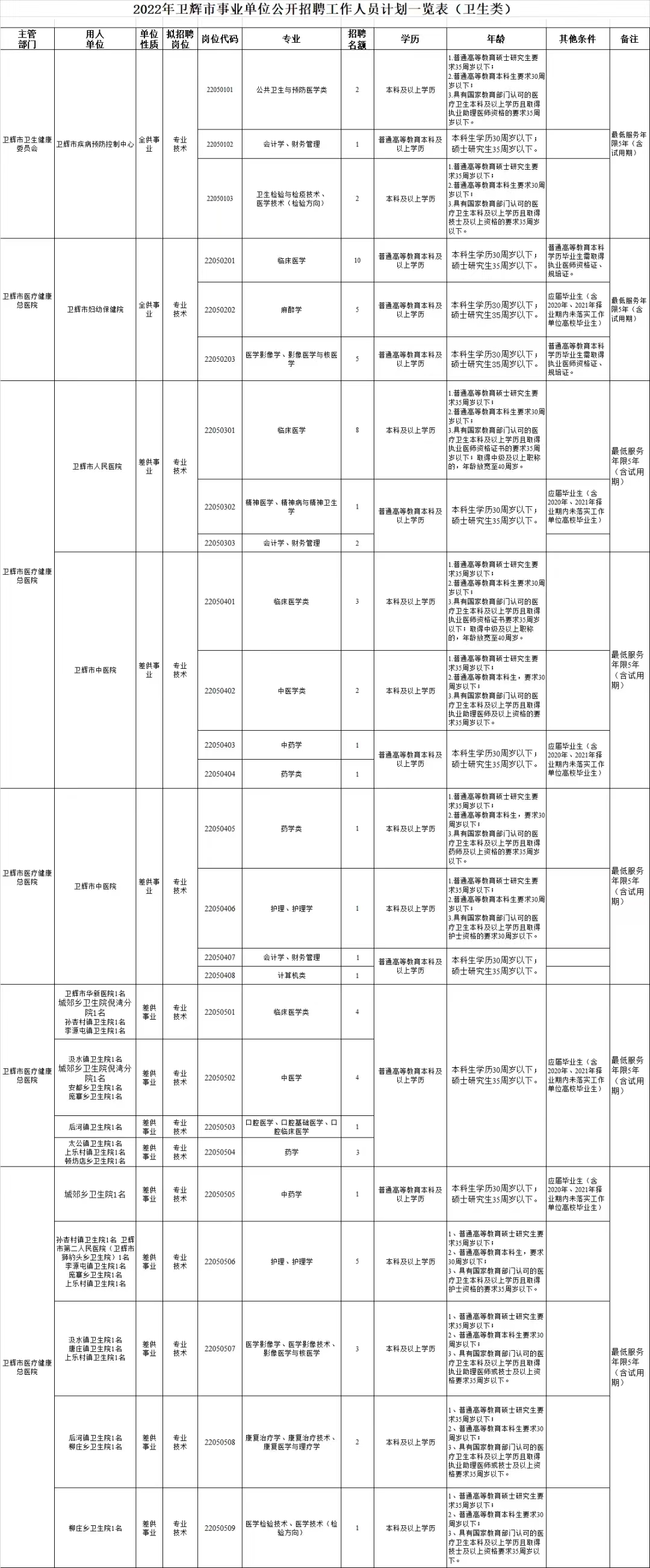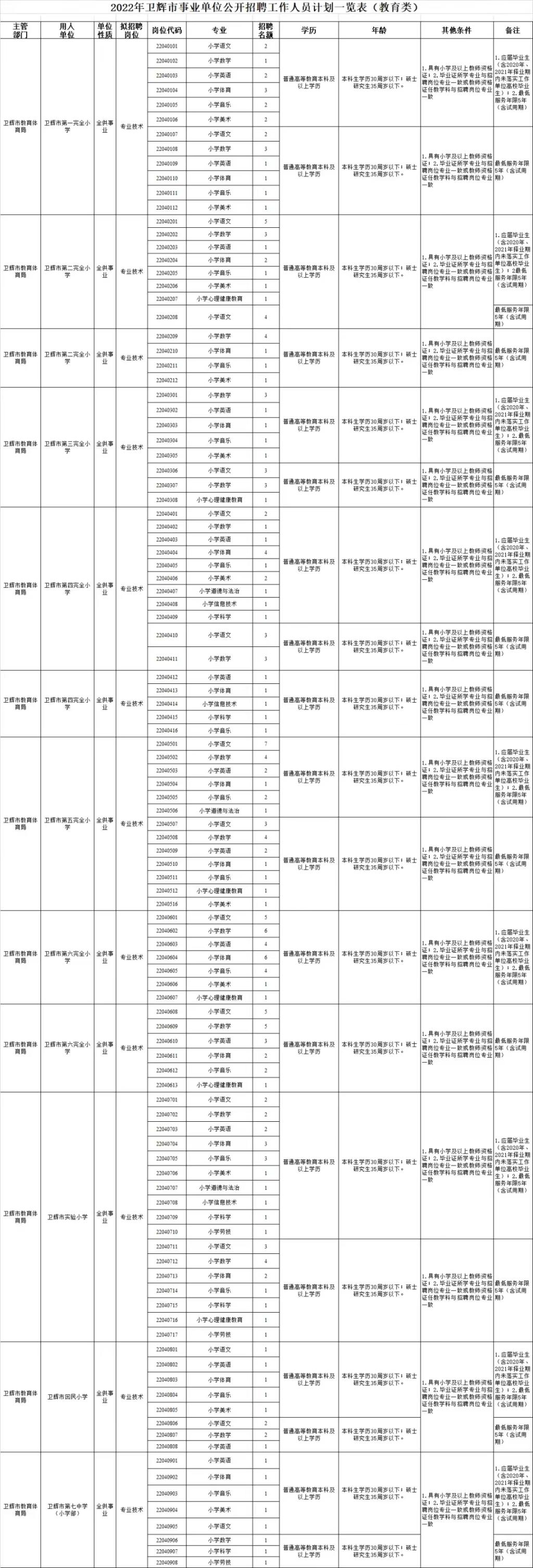 本次事业单位共计划招聘732人,其中市直11人、乡镇200人(含限制专业87人、不限制专业113人),教体系统450人(含高中教师40人、义务教育阶段教师405人、特殊教育公司教师5人),卫健系统71人(含事业全供25人、事业差供46人)。具体招聘计划及相关内容见《2022年卫辉市事业单位公开招聘工作人员计划一览表》(附件1)。