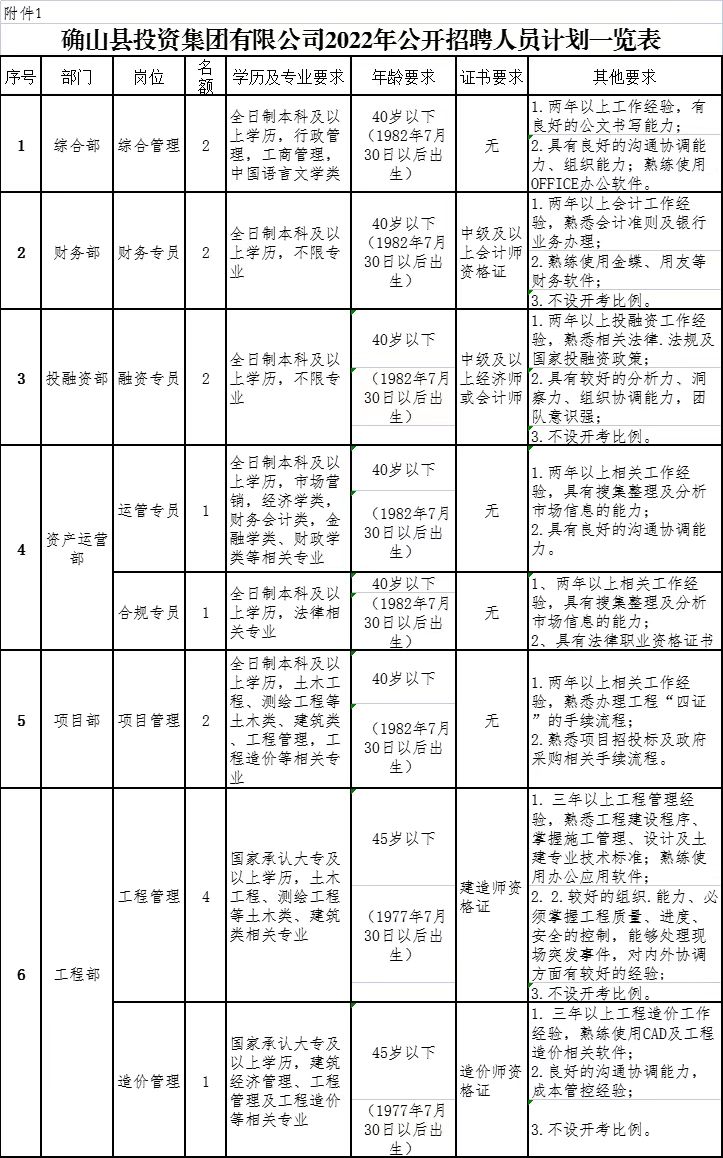 为加快推进我县投融资平台建设,促进平台转型,经县委常委会研究决定,确山县投资集团有限公司将面向社会招聘15名专业技术人员。为确保招聘工作的顺利进行,制定本实施方案。