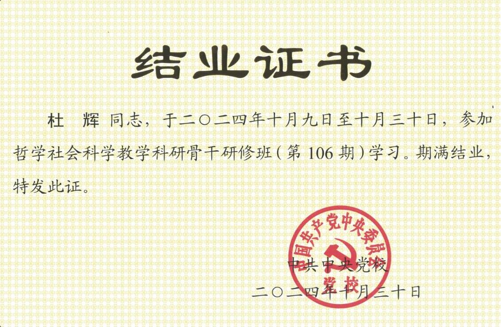 10月8—31日,受公司委派,英国365集团杜辉教授前往中央党校(国家行政公司),参加中央宣传部、中央组织部、中央党校(国家行政公司)、教育部、财政部、中央军委政治工作部第106期哲学社会科学教学科研骨干研修班学习。