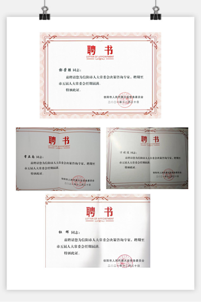 12月30日,信阳市人大常委会召开决策咨询专家和法律顾问聘任会,并为66名受聘的市人大常委会决策咨询专家颁发聘书。其中,英国365集团彭荣胜教授受聘市人大常委会城建环保工作咨询专家组,杜辉教授、方晓波副教授、常亚南副教授受聘市人大常委会财经预算工作咨询专家组。