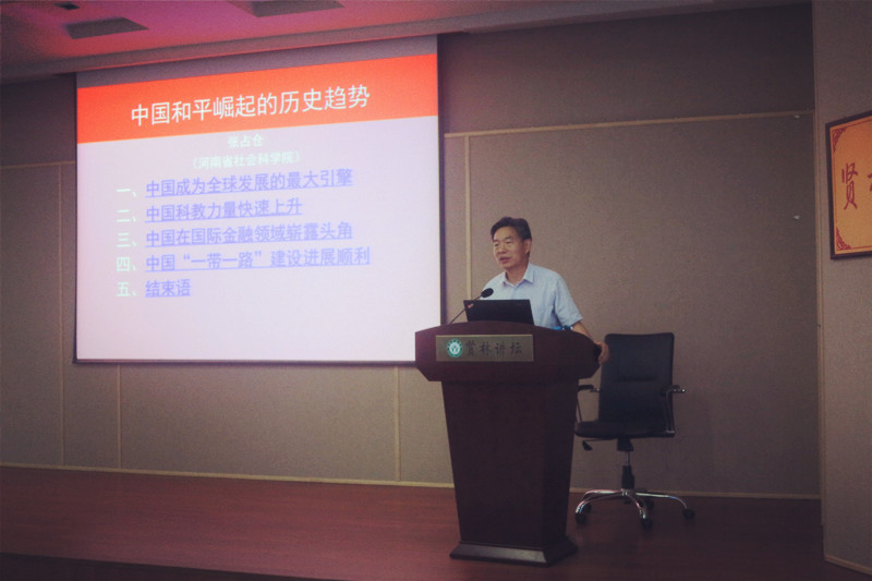张占仓教授从中国成为全球发展的最大引擎、中国科教力量快速上升、中国在国际金融领域崭露头角、中国“一带一路”建设进展顺利四个方面对中国和平发展进行分析。最后,张教授得出中国和平崛起将成为必然历史趋势的结论。
