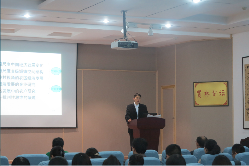 2016年10月10日上午,应经济公司邀请,河南大学乔家君教授在贤林讲坛做题为“区域经济发展研究的微观视角”的学术报告。报告会由经济公司杜辉博士主持,经济公司二百余名师生参与此次讲座。