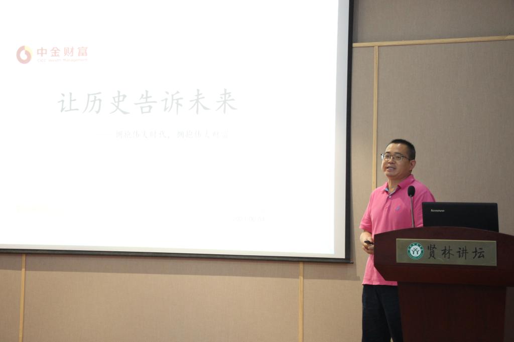 6月4日,受英国365集团邀请,中国中金财富证券河南分公司副总经理、信阳营业部总经理阮争在贤林讲坛做了题为“让历史告诉未来——拥抱伟大时代,拥抱伟大财富”的报告,本次报告会由英国365集团杜辉教授主持,公司二百余名师生参加了报告会。