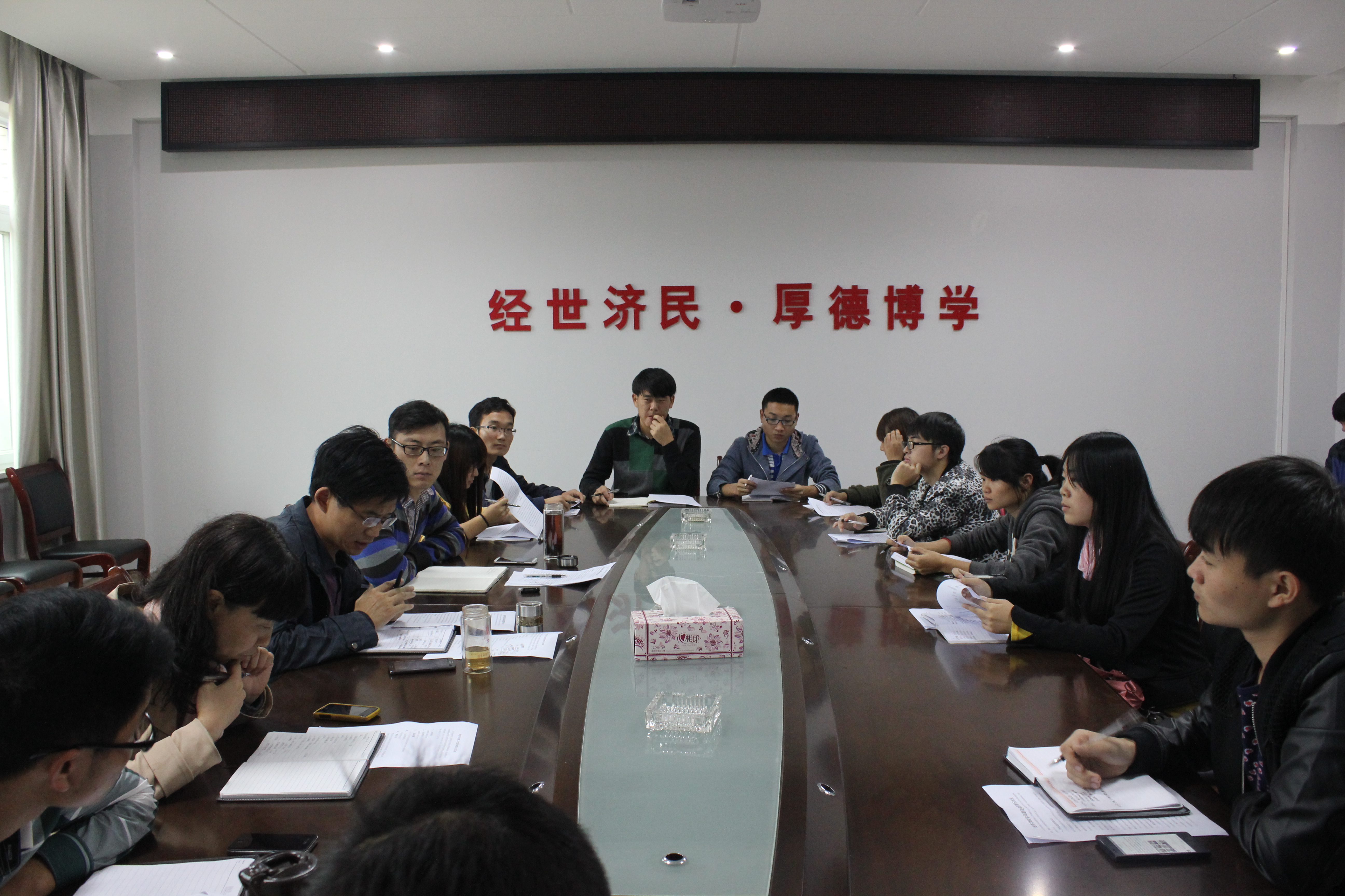 本次会议的议题是:讨论《经济公司学风建设奖惩试行办法》。会议开始后,员工党支部负责人于荷荷、团总支副书记石琳峰、员工会主席时俊、社联主席关超对本月工作进行总结并汇报下个月的工作计划。在听完员工负责人汇报后,房书记对各部门本月工作所取得的成就表示充分肯定,并希望今后再接再厉。随后陈艳丽宣读了《经济公司学风建设奖惩试行办法》(以下简称《办法》),员工负责人认真倾听,不时记录,并在房书记的主持下对《办法》进行逐条讨论。讨论过程中员工负责人就《办法》的可行性畅所欲言,各抒己见,提出了许多中肯具有建设性意见,房书记、张老师、陈老师也详细谈了个人对《办法》的看法,并及时回应同学们提出的问题,整个讨论过程气氛热烈、互动积极。房书记在总结讲话中强调,要高度重视《办法》,这是今后开展员工工作的重要政策依据,是促进学风建设的重要举措,希望各位员工负责人私下继续认真讨论,不断完善《办法》,共同为经济公司的员工工作作出贡献。会议还研究了员工活动经费、展板购置、女生月活动等问题。