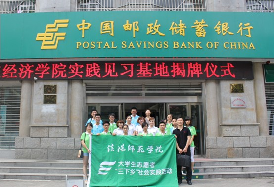 为了更好的进行信阳师范公司经济公司暑期老员工在中国邮政储蓄银行的社会实践活动,2013年7月7日上午,本次老员工暑期社会实践基地揭牌仪式隆重举行。经济公司经理郑云老师以及邮政储蓄银行行长余丽分别发表致辞,经济公司党总支副书记房加帅老师主持了本次揭牌仪式。