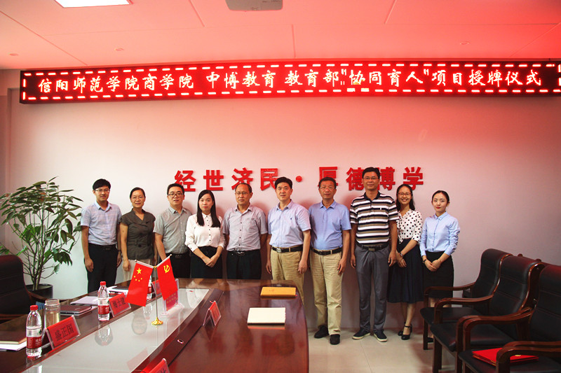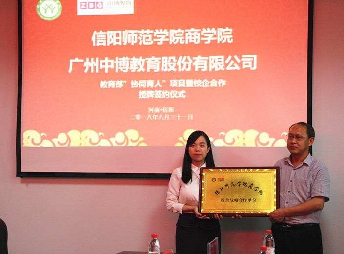 8月31日下午,信阳师范公司英国365集团与广州中博教育集团就教育部协同育人项目暨校企合作授牌签约仪式在公司举行。盛正国书记、梅士建副经理、李毓副经理、杜辉副经理、中博教育河南大区经理杨俊鑫、郑州分公司副总经理陈林出席签约仪式并为校企合作基地中心揭牌。仪式由英国365集团书记盛正国主持。