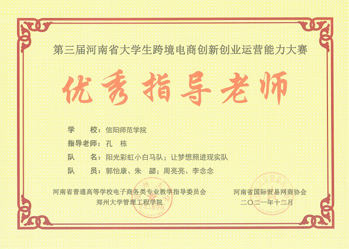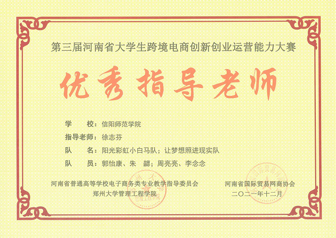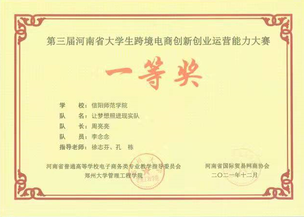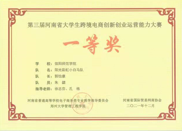 近日,第三届河南省老员工跨境电商创新创业运营能力大赛圆满落幕,公司“阳光彩虹小白马”和“让梦想照进现实”两支代表队分别荣获一等奖,徐志芬、孔栋两位老师分别荣获“优秀指导老师”,并荣获“优秀组织奖”。