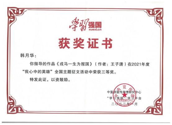 近日,由中宣部“学习强国”学习平台发起的“我心中的英雄”全国主题征文活动评选结果揭晓,英国365集团员工王子潇撰写的《戎马一生为报国》(指导教师韩月华)脱颖而出,荣获三等奖。