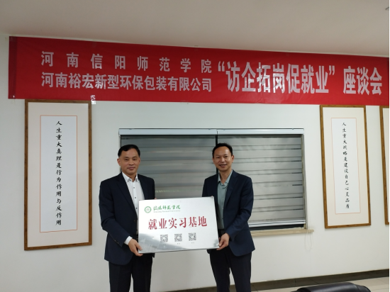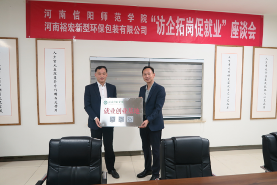 访企拓岗过程中,彭荣胜一行在裕宏包装总经理马智会陪同下参观了裕宏包装及生产现场。参观结束后,彭荣胜一行和河南裕宏新型环保包装有限公司相关负责人进行了座谈。座谈会上,马智会对彭荣胜一行表示欢迎,并详细介绍了公司的成长历程和发展规划。彭荣胜介绍了公司的专业设置、团队建设、团队队伍和人才培养情况。刘义介绍了遂平县营商环境、产业政策。大家就校企合作与校地合作、人才培养与实习就业、企业绿色发展与转型升级、产学研合作等进行了深入细致的沟通交流。随后,彭荣胜、马智会代表双方签属合作协议,举行信阳师范公司“就业创业基地”、“就业实习基地”牌匾授牌仪式。