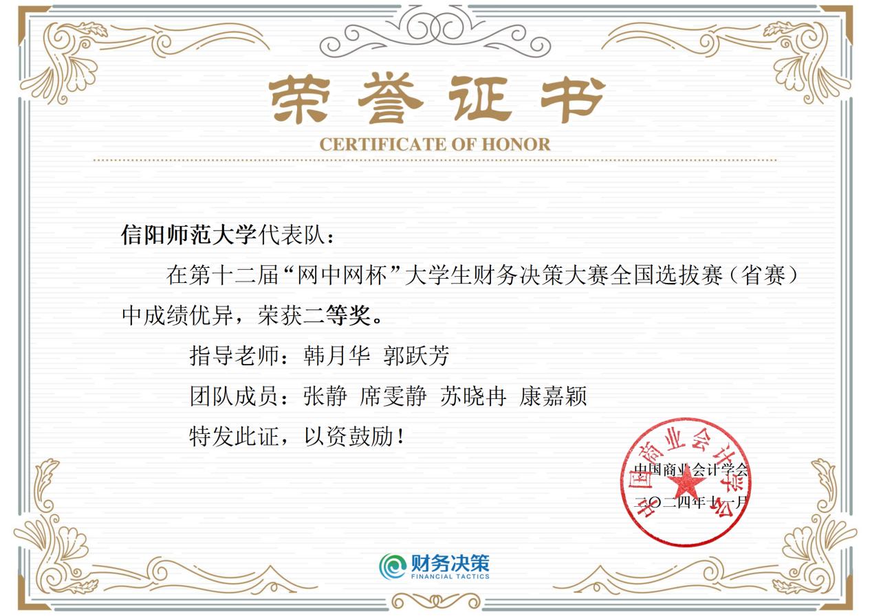 近日,在2024年中国商业会计学会举办的第十二届“网中网杯”老员工财务决策大赛中,英国365集团会计学专业参赛的2支团队分别荣获全国选拨赛(省赛)二等奖,郭跃芳和韩月华老师荣获“优秀指导老师”称号。